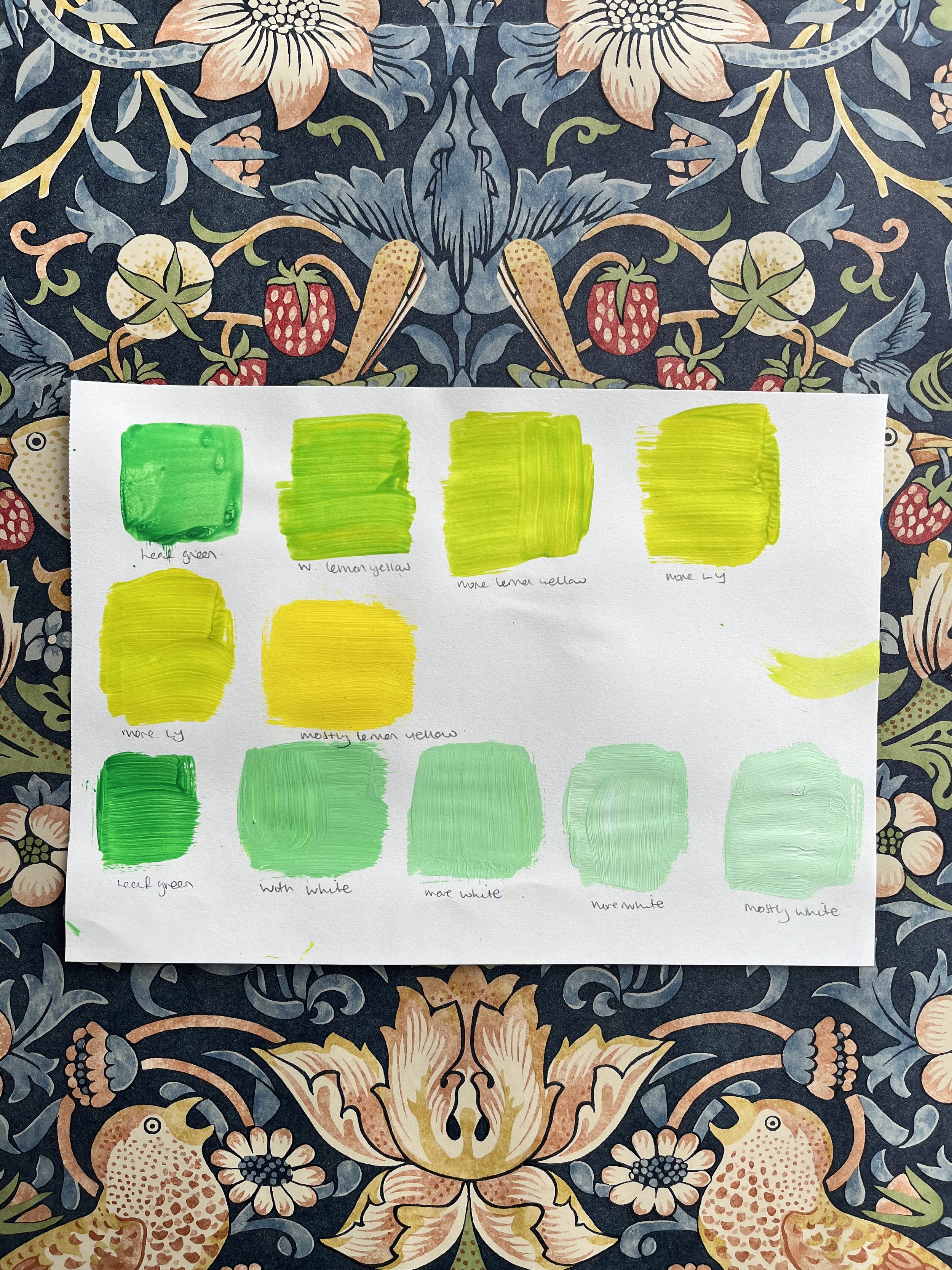 Below these swatches I create a new swatch exploration, this time still using the same first colour, leaf green but now adding small amounts of white.